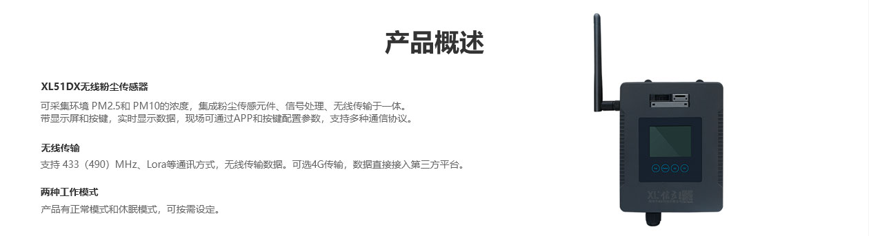 XL51DX無線粉塵傳感器,采集環境 PM2.5和 PM10的濃度,集成粉塵傳感元件、信號處理、無線傳輸于一體。帶顯示屏和按鍵,實時顯示數據,現場可通過APP和按鍵配置參數,支持多種通信協議