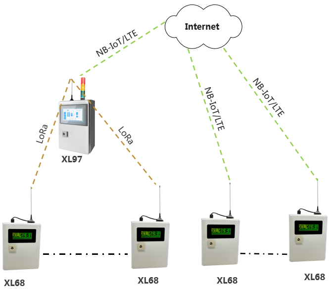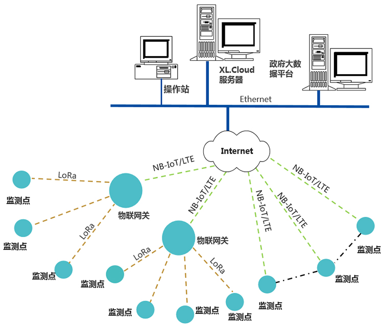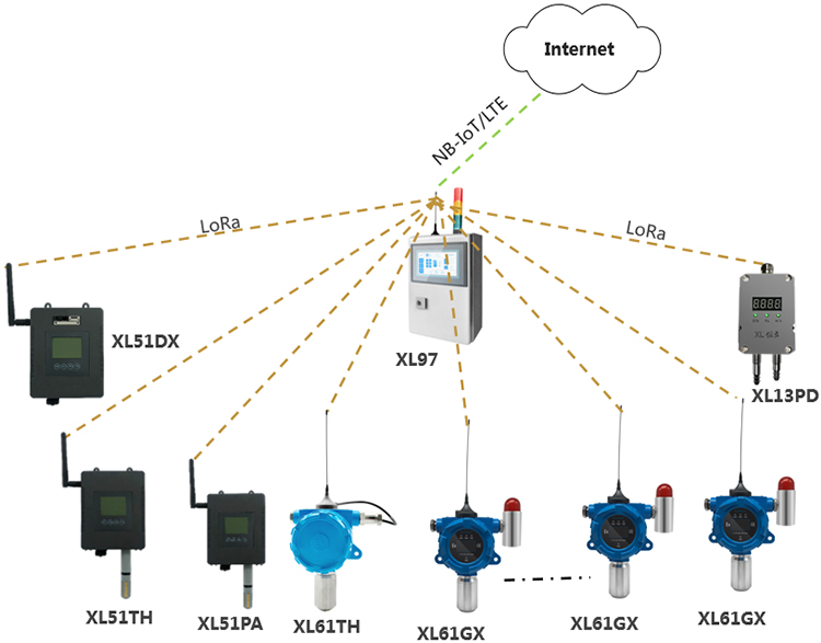 在需要監(jiān)測環(huán)境參數(shù)的場景,選擇XL97網(wǎng)關(guān)終端,讀取傳感器的數(shù)據(jù),通過4G/NB推送至監(jiān)控平臺;