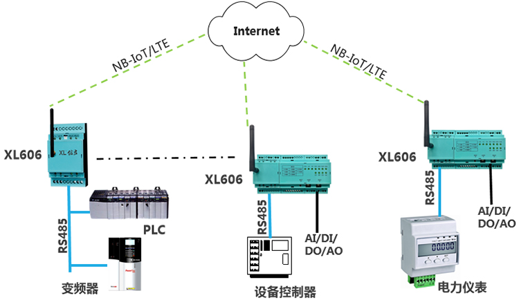 選擇XL60主機模塊,加I/O模塊,采集環(huán)保設(shè)備的運行信號;通過RS485/Ethernet接口,從機器控制器、PLC讀取設(shè)備運行數(shù)據(jù);通過NB/4G上傳數(shù)據(jù)到平臺,4G網(wǎng)絡(luò)信號更穩(wěn)定;