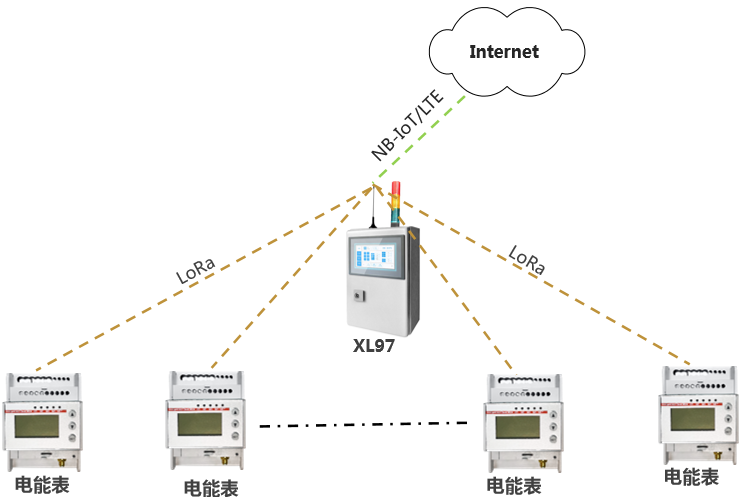 對于一家企業(yè),需要對多臺環(huán)保設(shè)備用電數(shù)據(jù)進行采集的情況,在每個用電監(jiān)測點,配置1塊DTSD3366/XL無線智能電表,采集該回路的用電數(shù)據(jù),上傳至XL97網(wǎng)關(guān)終端(數(shù)據(jù)傳輸終端);
