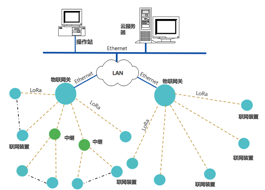 聯(lián)網(wǎng)裝置,采集設(shè)備運(yùn)行數(shù)據(jù),通過(guò)LoRa上傳數(shù)據(jù)至物聯(lián)網(wǎng)關(guān),網(wǎng)關(guān)通過(guò)Ethernet或Wi-Fi,接入云平服務(wù)器;