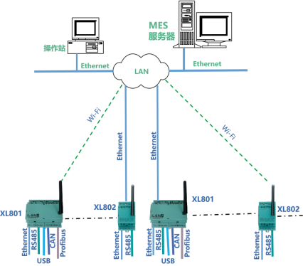 XL80通信主機,從設(shè)備通信接口,讀取設(shè)備或系統(tǒng)的運行數(shù)據(jù),通信協(xié)議轉(zhuǎn)換處理后,再通過Ethernet或Wi-Fi,接入LAN,轉(zhuǎn)發(fā)數(shù)據(jù)至MES。