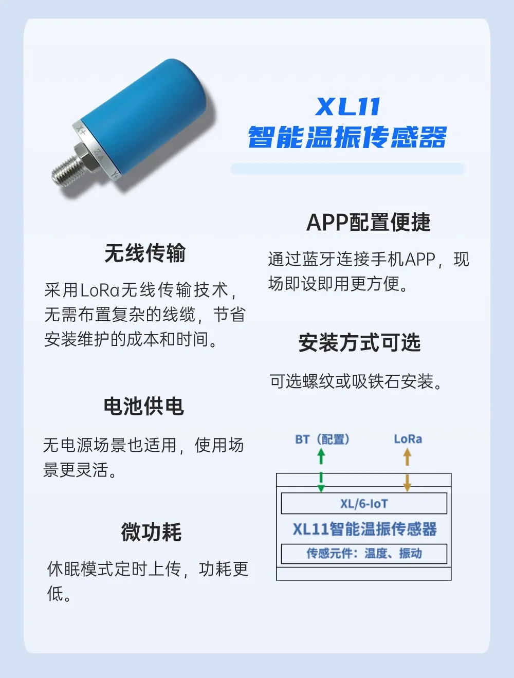 選擇XL11智能溫振傳感器,安裝在高爐、轉爐、連鑄機、熔煉爐等設備的電機和減速機上,實時采集溫度和X、Y、Z三個方向的振動數據,為設備運行狀態的分析判斷提供數據支撐。