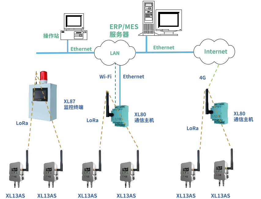 XL13AS無線風(fēng)管風(fēng)速傳感器通過LoRa無線傳輸方式,將數(shù)據(jù)上傳至XL802通信主機,通信主機可選以太網(wǎng)、Wi-Fi、4G通信方式,推送數(shù)據(jù)至監(jiān)控平臺、企業(yè)生產(chǎn)管控服務(wù)器等。