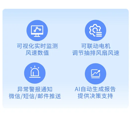 根據(jù)現(xiàn)場需求,可聯(lián)動電機,當風(fēng)速過小或者過大,自動調(diào)節(jié)抽排風(fēng)扇的轉(zhuǎn)速,以保持風(fēng)速控制在合適范圍內(nèi)。